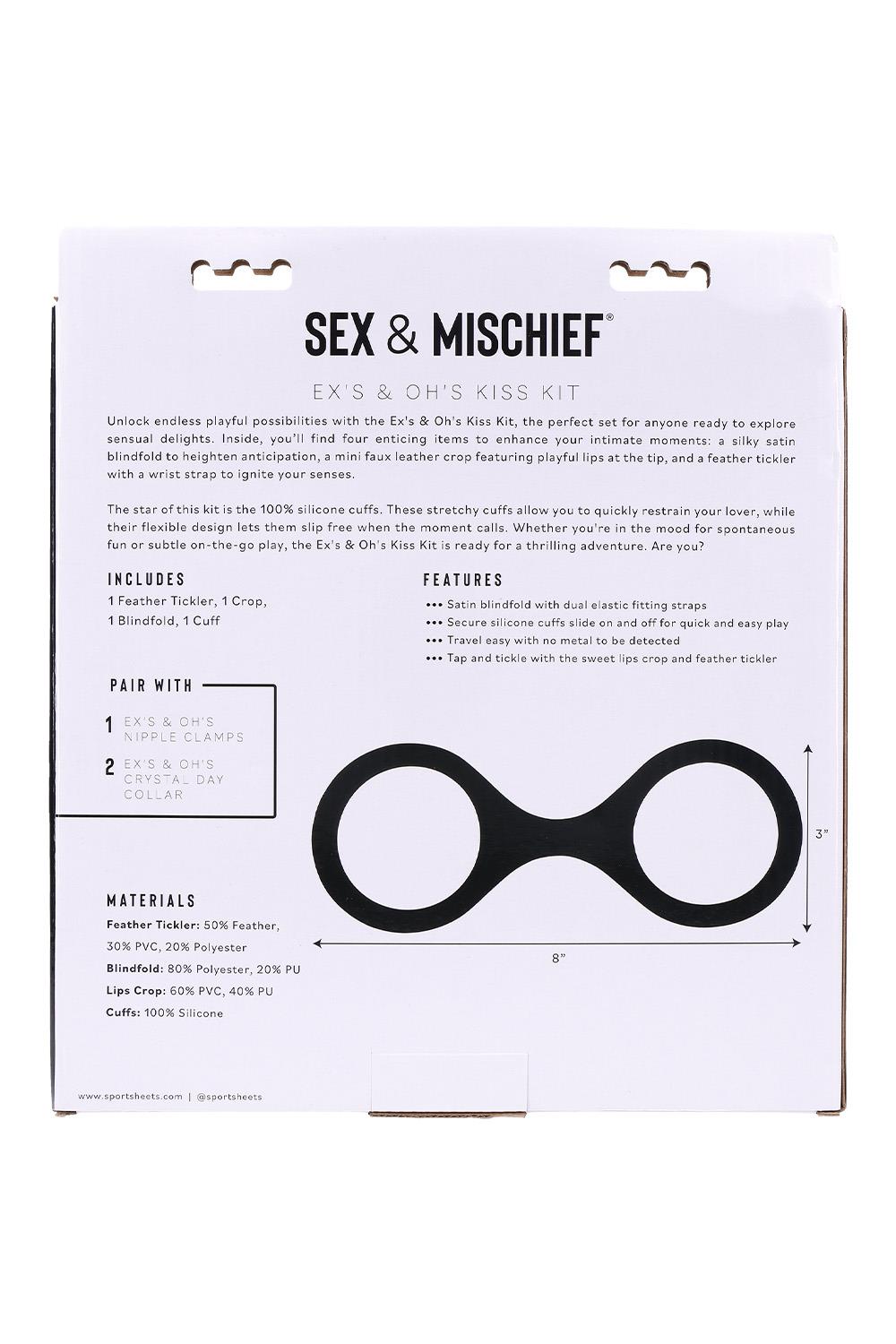 Ava lõputud vallatud võimalused Ex’s & Oh’s Kiss Kitiga – täiuslik komplekt kõigile, kes soovivad avastada sensuaalseid naudinguid. Komplektist leiad neli ahvatlevat eset, mis rikastavad intiimseid hetki: siidise satiinist silmakatte ootusärevuse suurendamiseks, mängulise huultega kunstnahast piitsa ning randmerihmaga sulgedega kõditaja.